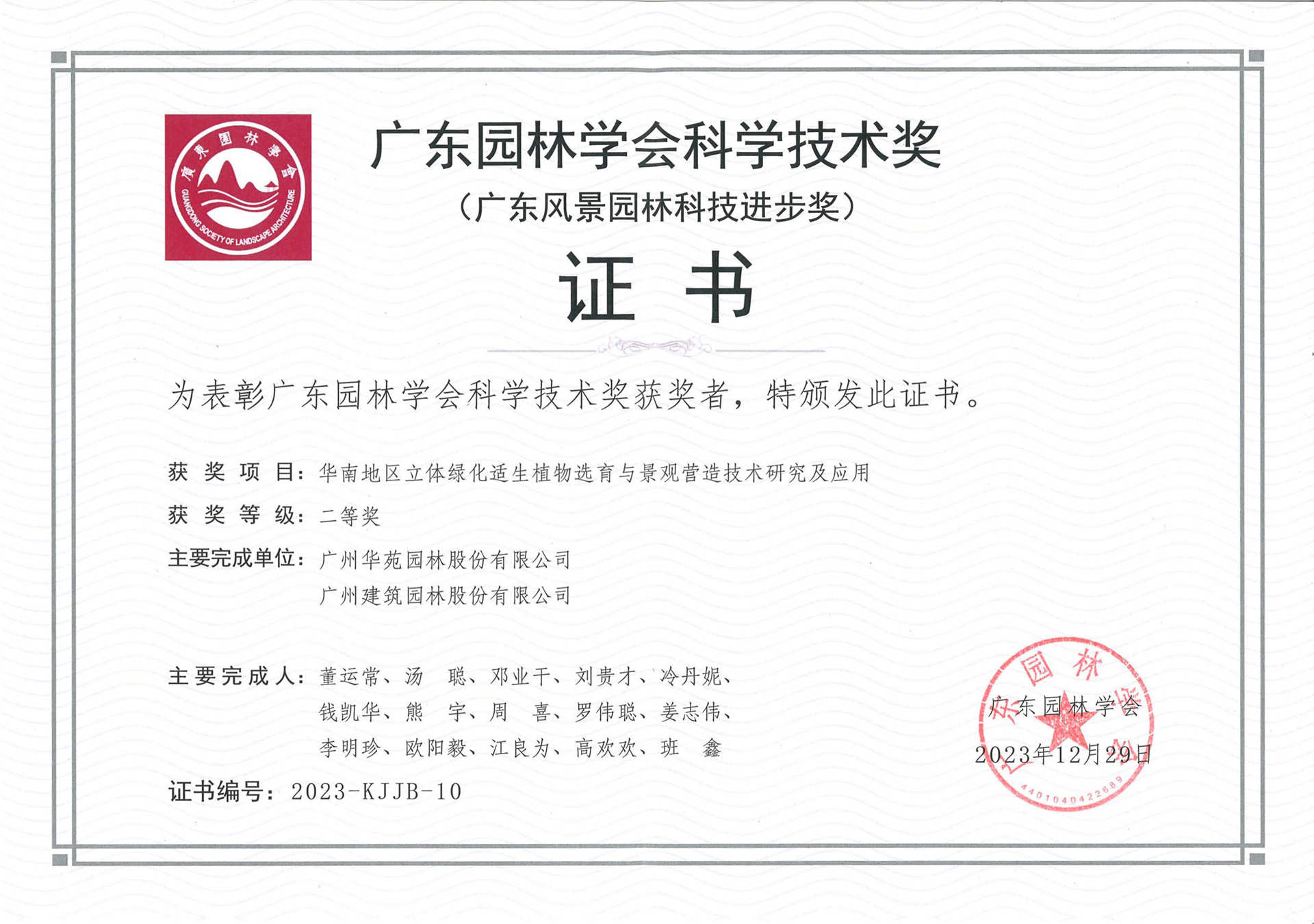 2023年中國風(fēng)景園林學(xué)會(huì)科技進(jìn)步獎(jiǎng)三等獎(jiǎng)——華南地區(qū)立體綠化適生植物選育與景觀營造技術(shù)研究及應(yīng)用