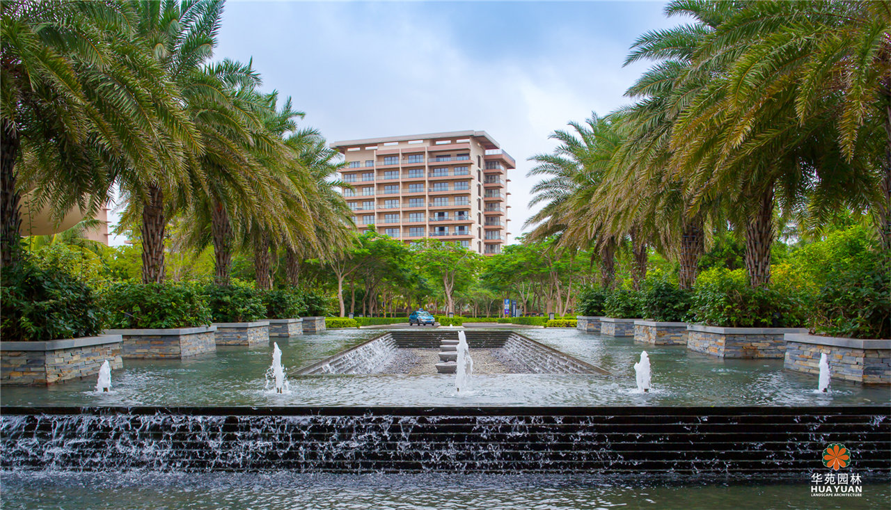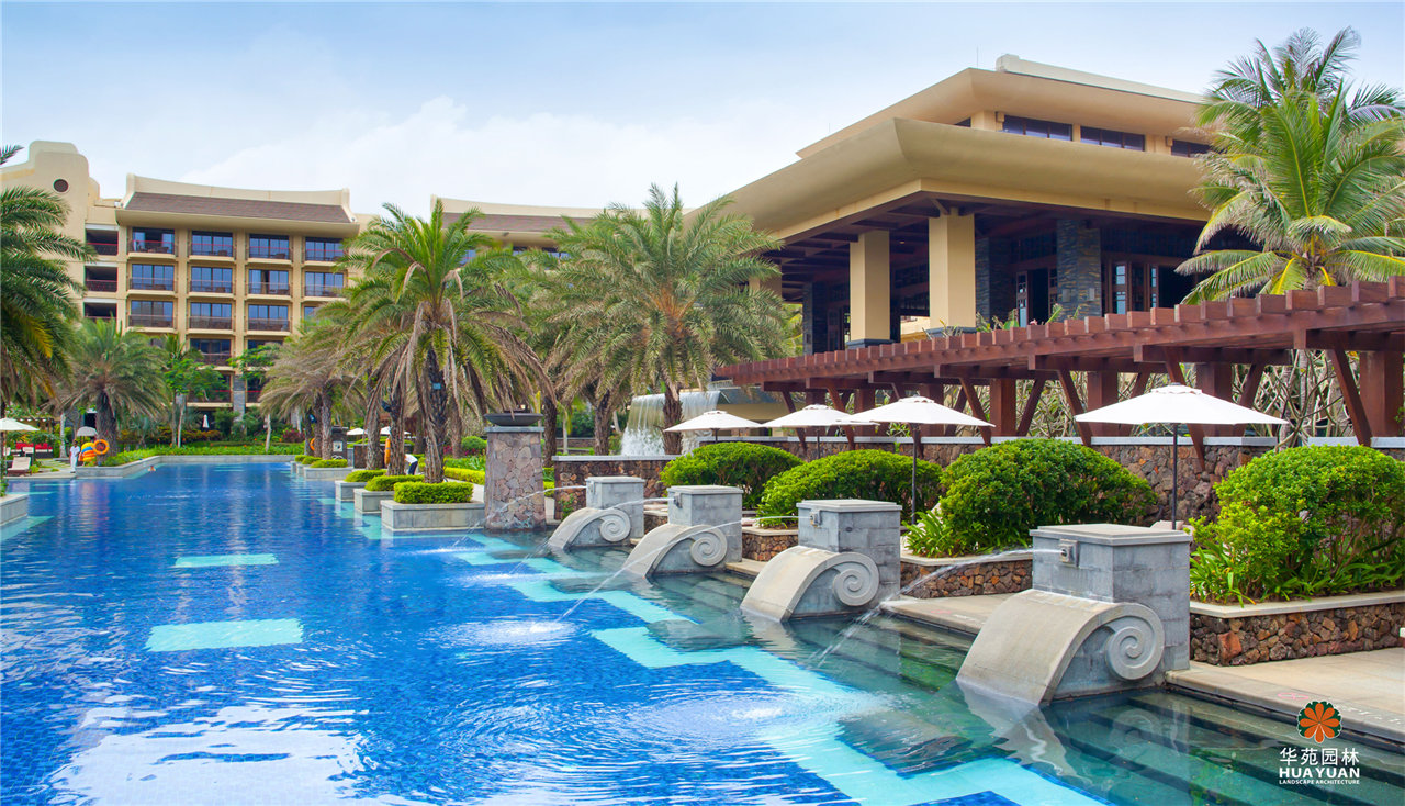 頗具氣勢(shì)的跌水水景,列植兩側(cè)、形態(tài)相似的銀海棗;開(kāi)敞的泳池,點(diǎn)綴特色造型噴水雕塑,樂(lè)享輕松、愉悅的度假生活。