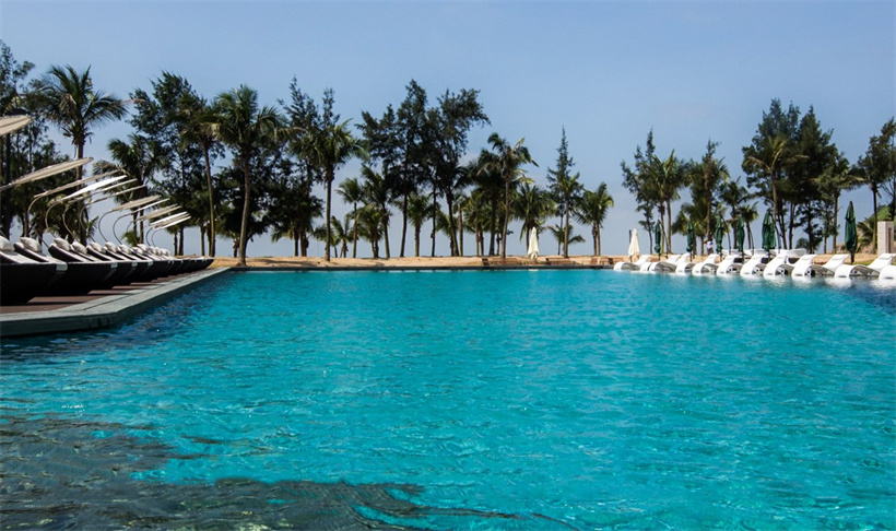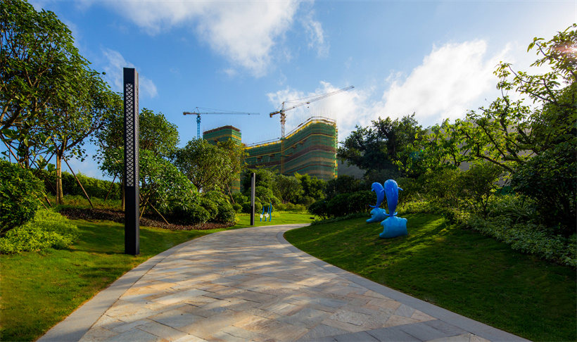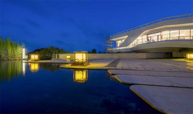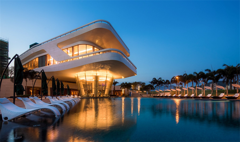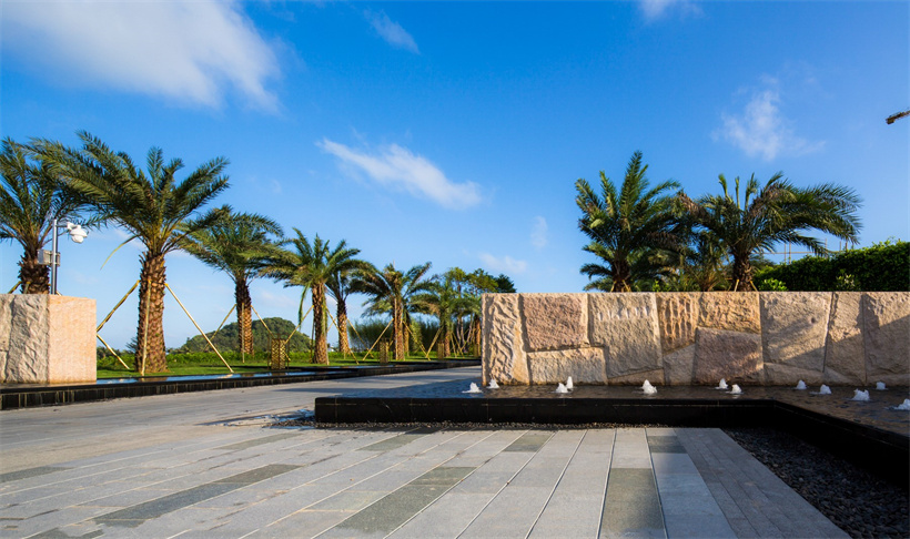 保利順峰·北洛秘境是保利集團(tuán)與順峰集團(tuán)合作的高端旅游度假項目。大塊異形自然面石材鋪貼的入口景墻、跌級水景及列植銀海棗,儀式感頓生;開敞的休閑平臺被大幅鏡面跌水景觀所環(huán)繞,簡約、高雅。