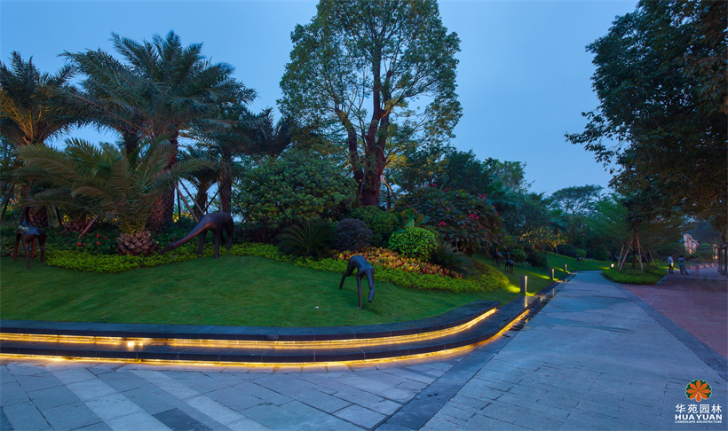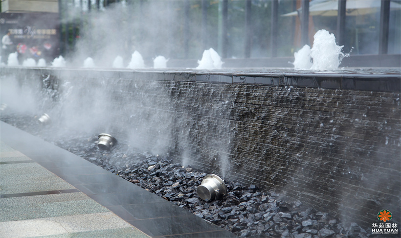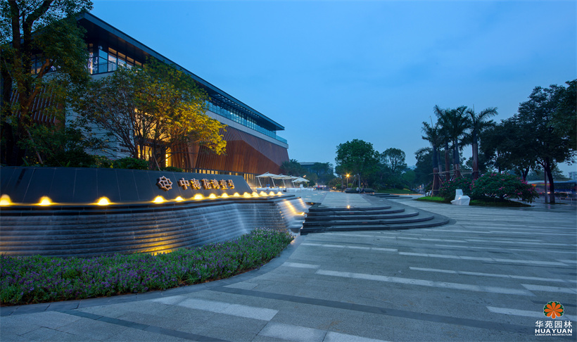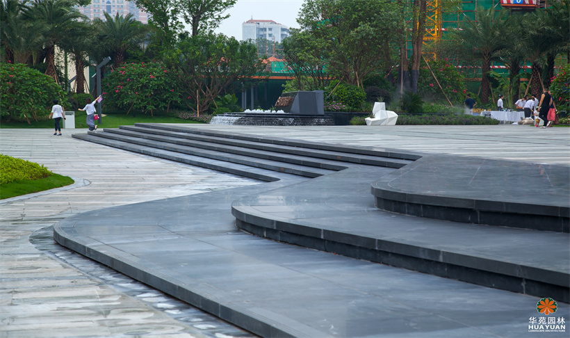 中?;骋继?hào)展示區(qū)園林景觀,以三種不同灰度的天然石材拼鋪的線形鋪裝,層級(jí)式跌水景觀以精選的自然面石材飾面,細(xì)膩的拼鋪技巧,令飾面連貫、流暢,整體感強(qiáng),配合霧森系統(tǒng)與燈光效果,更顯靈動(dòng)。