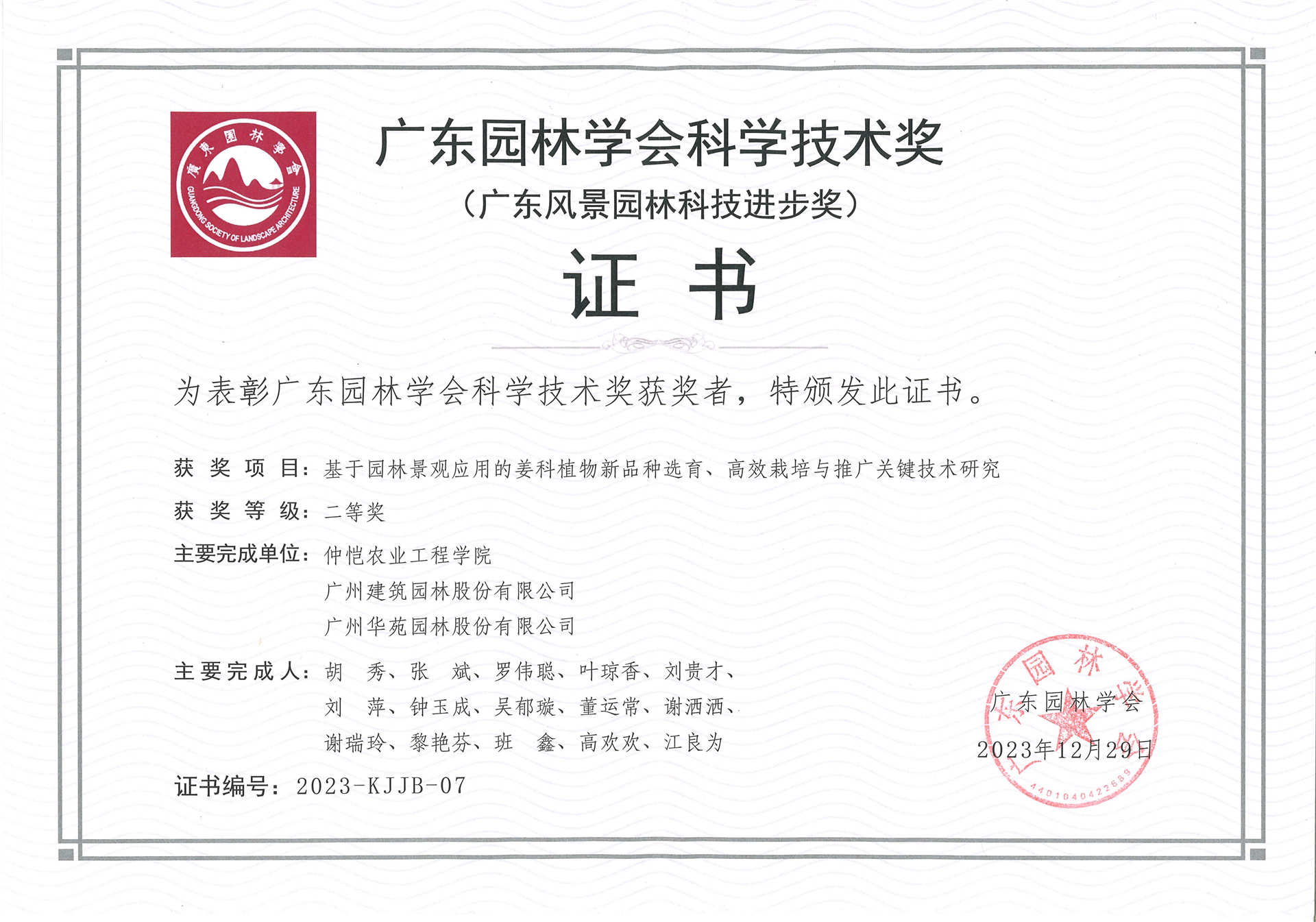 2023年廣東風(fēng)景園林科技進(jìn)步二等獎(jiǎng)——基于園林景觀應(yīng)用的姜科植物新品種選育、高效栽培與推廣關(guān)鍵技術(shù)研究