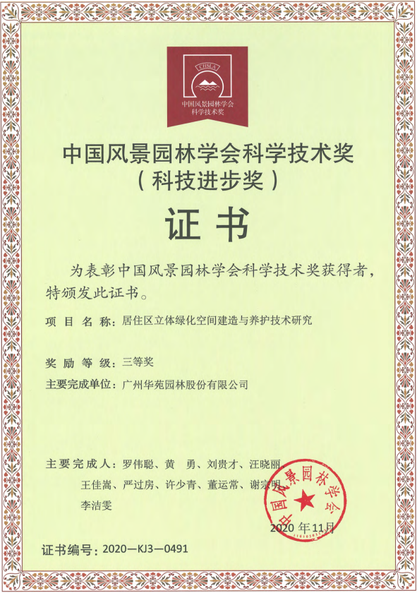 2023年中國風(fēng)景園林學(xué)會(huì)科技進(jìn)步獎(jiǎng)三等獎(jiǎng)——華南地區(qū)立體綠化適生植物選育與景觀營造技術(shù)研究及應(yīng)用