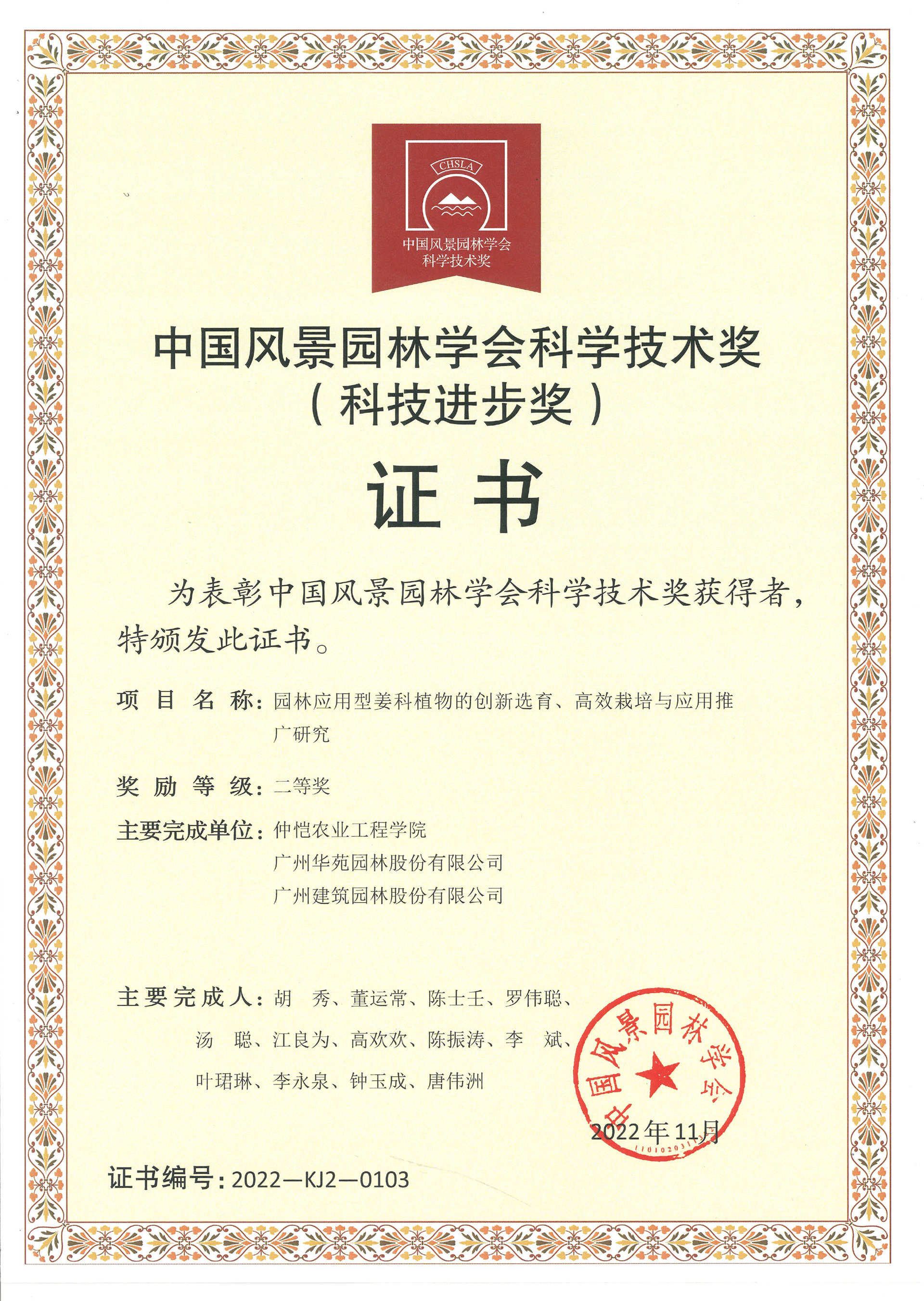 202年中國風(fēng)景園林學(xué)會(huì)科技進(jìn)步獎(jiǎng)三等獎(jiǎng)——園林應(yīng)用型姜科植物的創(chuàng)新選育、高效栽培與應(yīng)用推廣研究