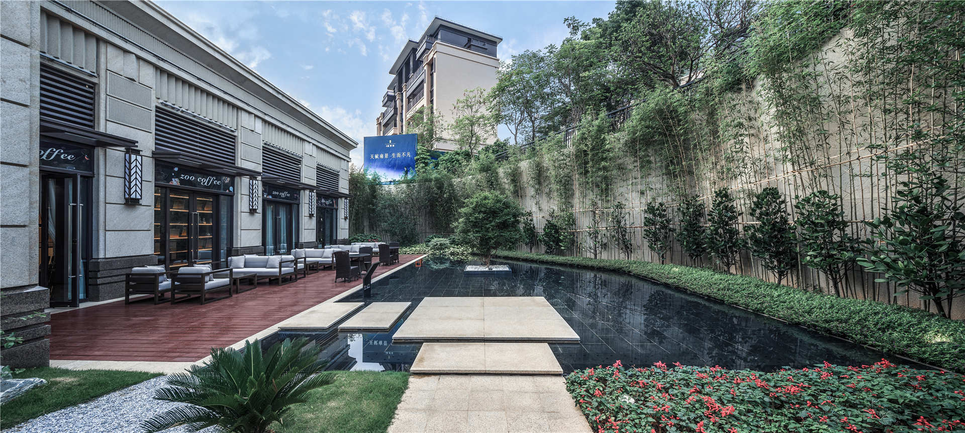 項(xiàng)目依山傍水,隱于自然,在山水之中得到設(shè)計(jì)啟發(fā),以現(xiàn)代的手法詮釋蘊(yùn)含東方哲學(xué)的“山、水、院”,圍繞“山水大境、雍然生活”的概念,營造低碳智慧、樂山悅水的居住環(huán)境。