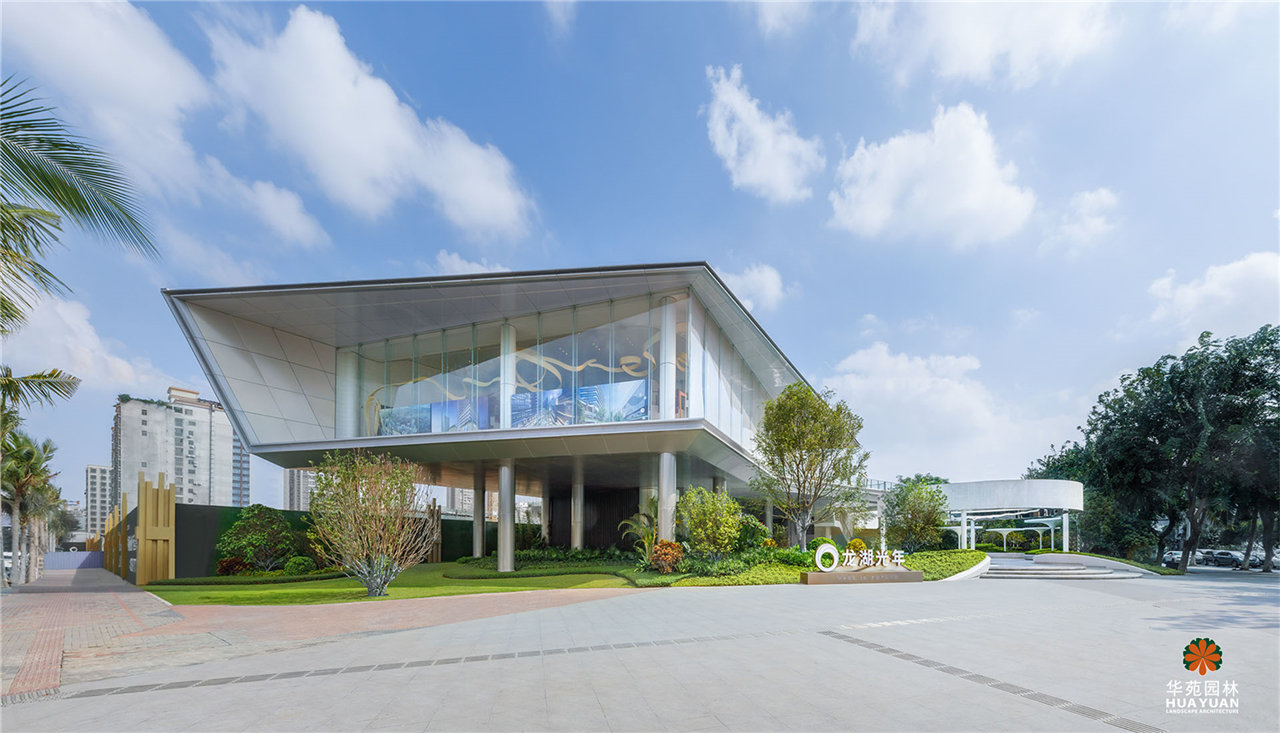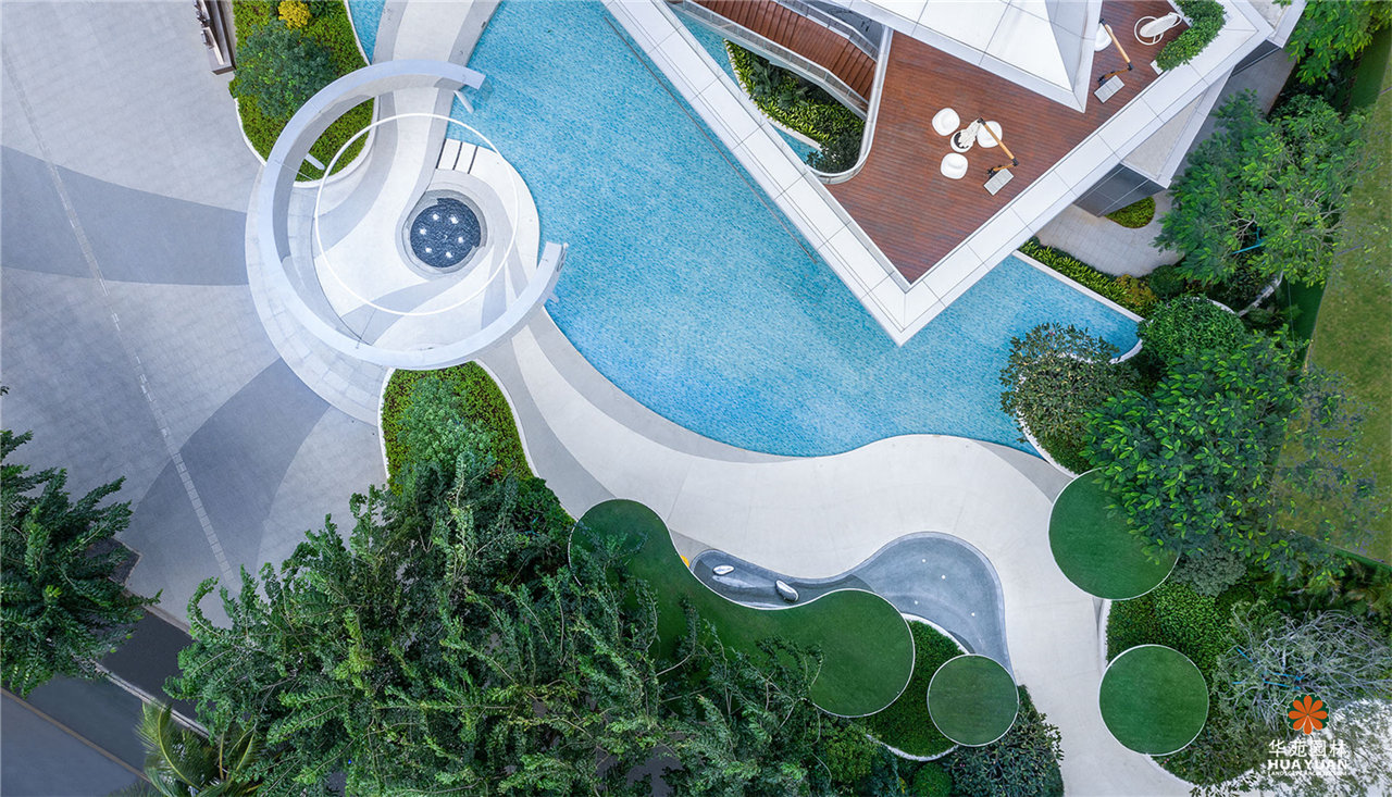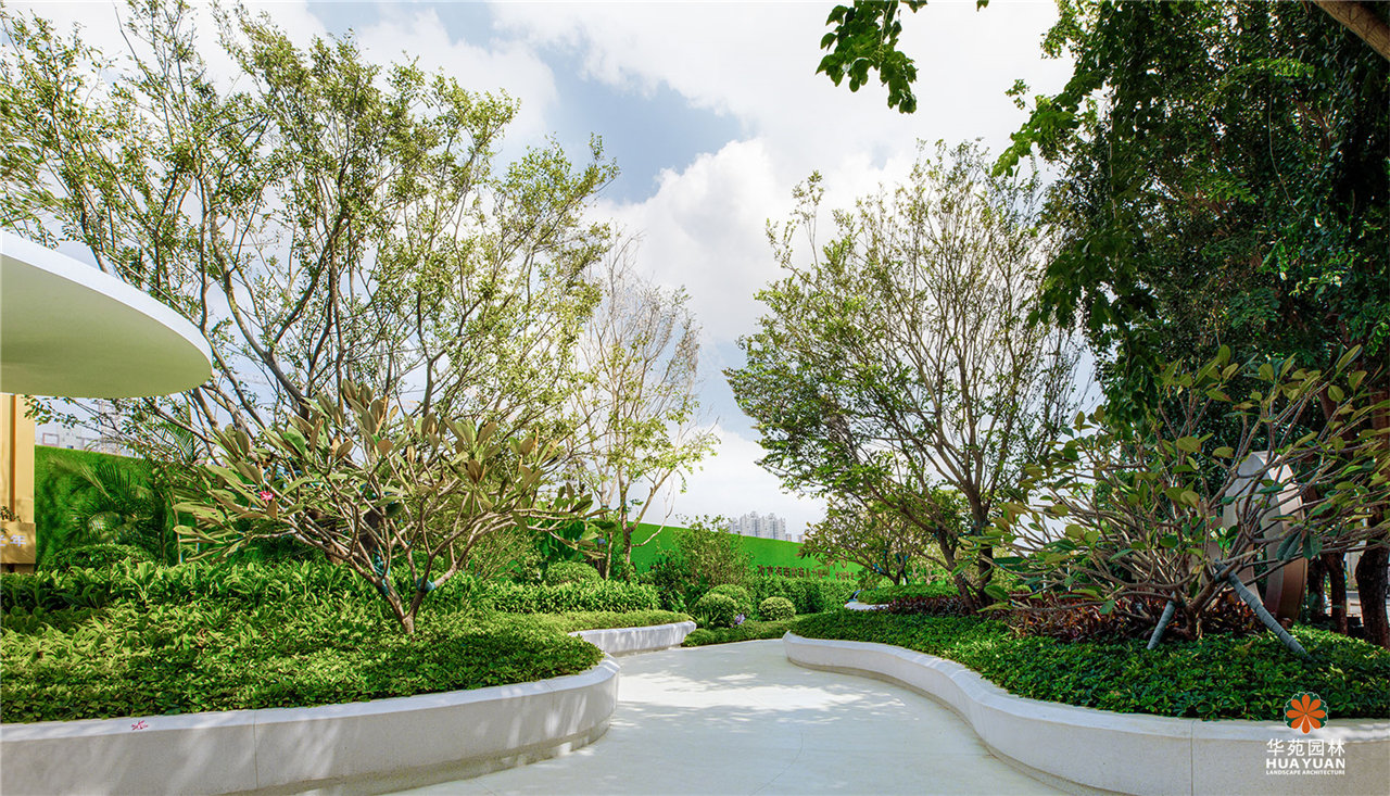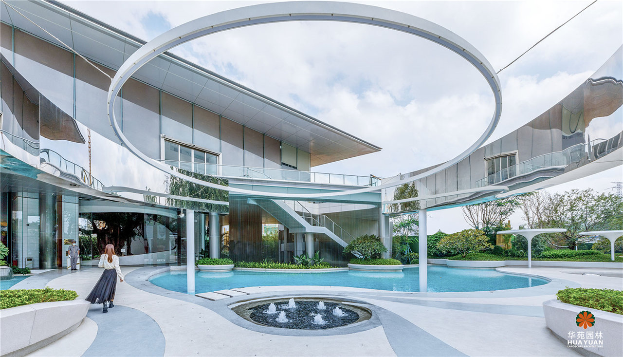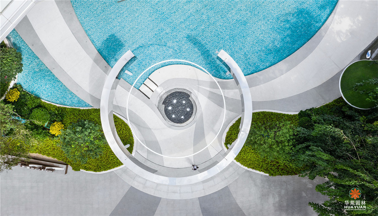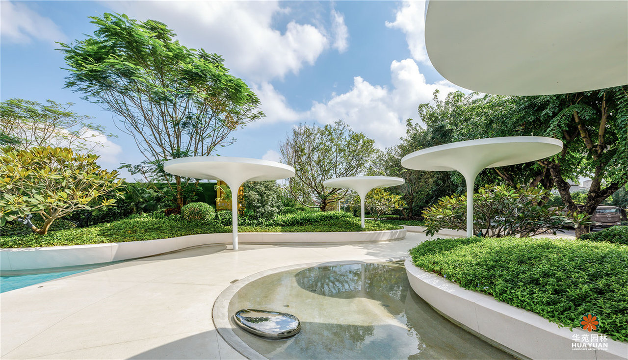 景觀以灰、白、藍為主調,運用多種弧形線條及燈光效果,搭配豐茂的綠植景觀,打造風格現(xiàn)代、造型精巧的景觀空間。