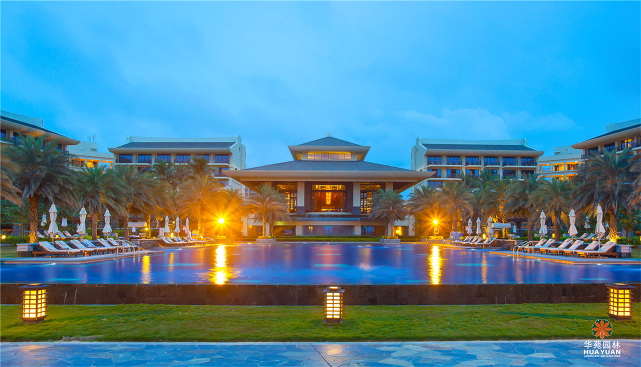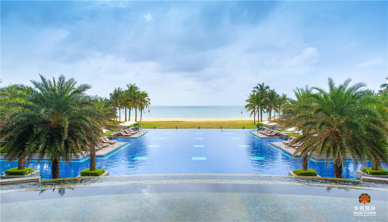 頗具氣勢(shì)的跌水水景,列植兩側(cè)、形態(tài)相似的銀海棗;開(kāi)敞的泳池,點(diǎn)綴特色造型噴水雕塑,樂(lè)享輕松、愉悅的度假生活。