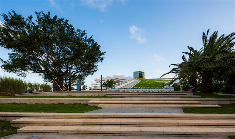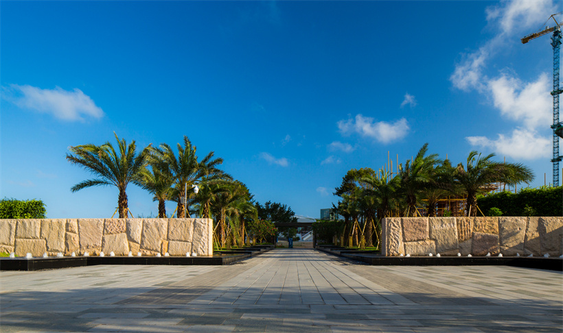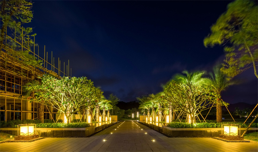 保利順峰·北洛秘境是保利集團(tuán)與順峰集團(tuán)合作的高端旅游度假項目。大塊異形自然面石材鋪貼的入口景墻、跌級水景及列植銀海棗,儀式感頓生;開敞的休閑平臺被大幅鏡面跌水景觀所環(huán)繞,簡約、高雅。