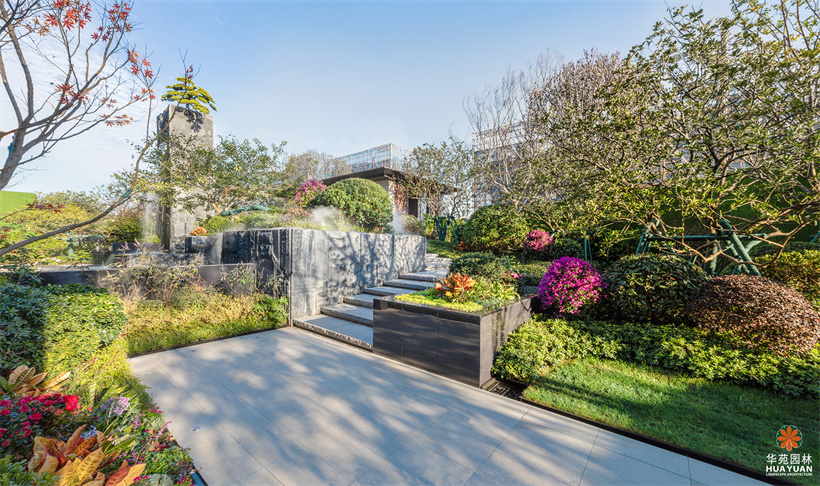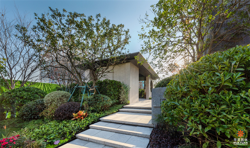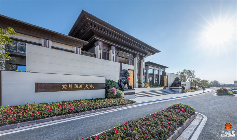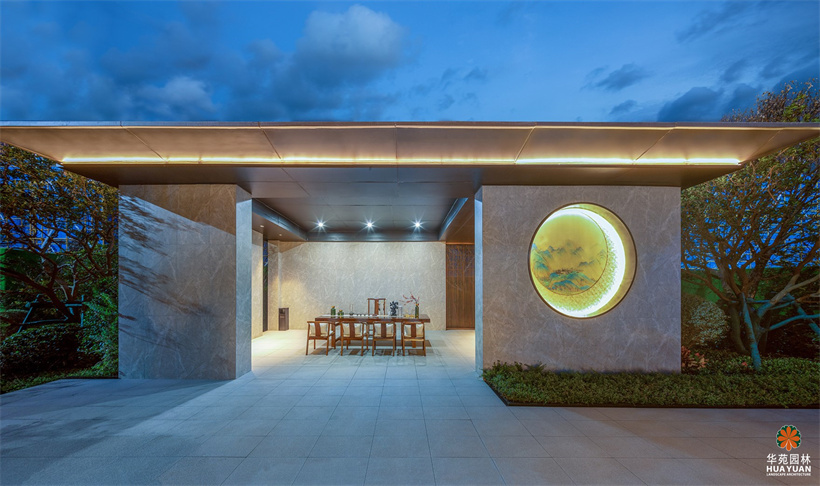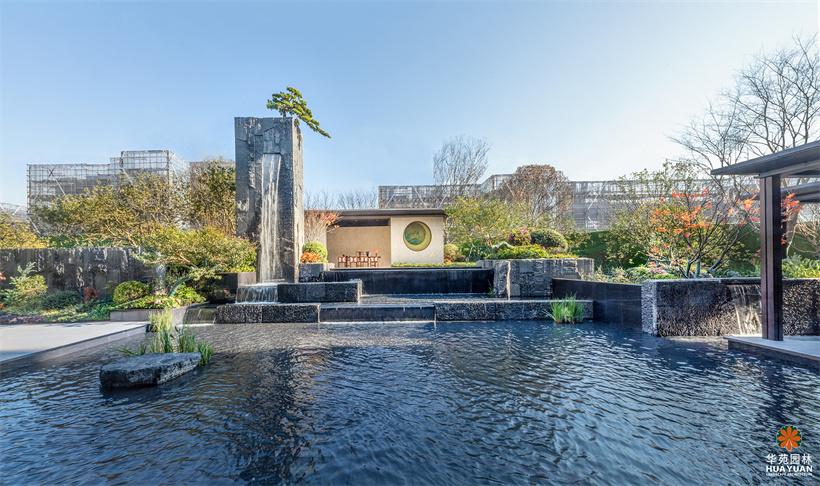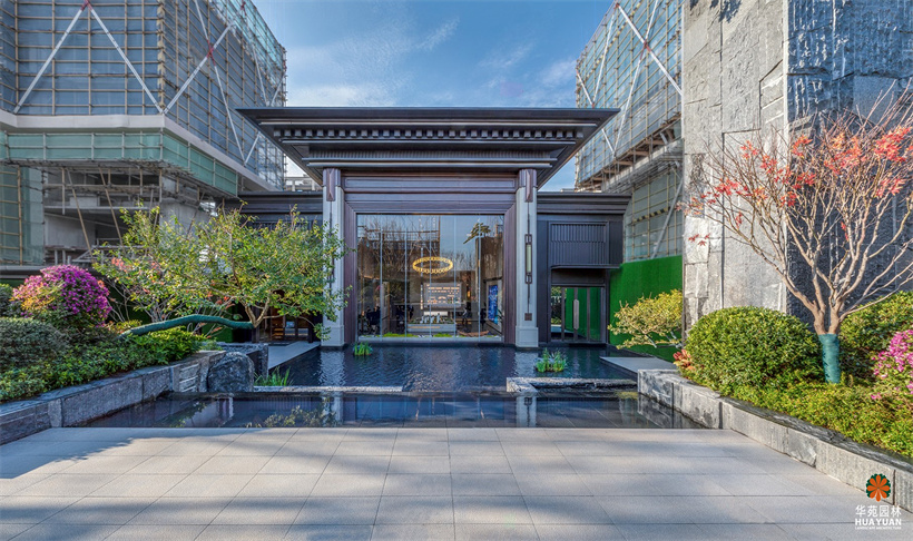 項目展示區(qū)采用新中式園林風格,融合傳統(tǒng)院落禮儀格局,以中心水景為核心展開,營造典雅而富有現(xiàn)代東方意趣的景觀空間。