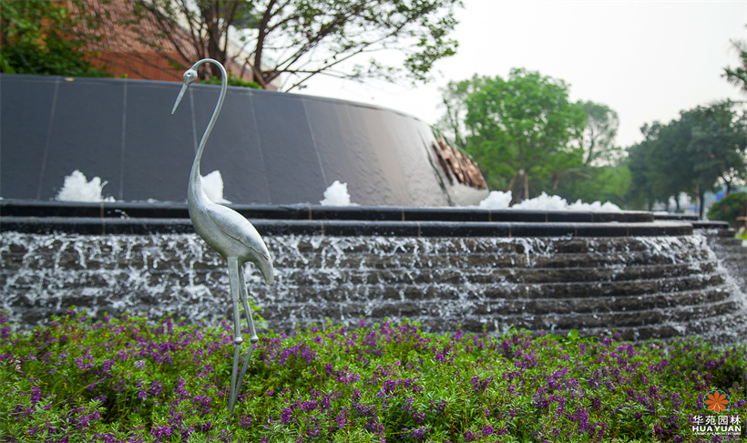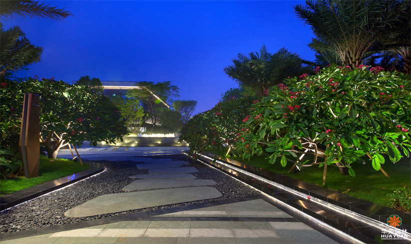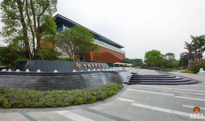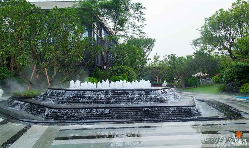 中?;骋继?hào)展示區(qū)園林景觀,以三種不同灰度的天然石材拼鋪的線形鋪裝,層級(jí)式跌水景觀以精選的自然面石材飾面,細(xì)膩的拼鋪技巧,令飾面連貫、流暢,整體感強(qiáng),配合霧森系統(tǒng)與燈光效果,更顯靈動(dòng)。